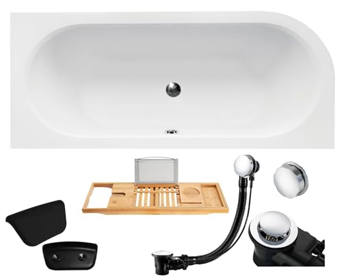 Specificaties: Badland Badkuip, origineel wit, acryl, hoekbad Avita, 180 x 80 cm, rechts, complete set + bamboe legplank + hoofdsteun + poten en exclusieve automatische afvoergarnituur, Made in EU, 5-in-1